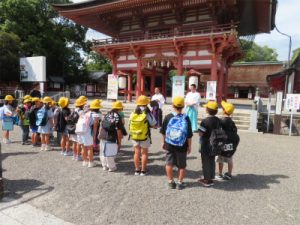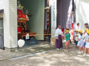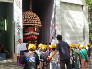 歴史と伝統文化がある津島市の象徴である津島神社は、子どもたちにとても親しみのある場所です。神社の歴史や「尾張津島天王祭」について、詳しく教えていただきました。また、巻藁船や車楽船の三分の一模型を見せてもらったり、巻藁船の提灯がついた竿を持たせてもらったりしました。