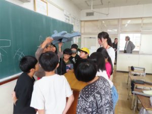 今日は、ご家族の体験や原爆による惨状についての手記を朗読され、子どもたちなりに理解や考えを深める様子がうかがえました。また、子どもたちは講話後も、お話の中で見せていただいたB―29の手作りの模型について、講師の方に質問をする様子が見られました。子どもたちにとって、原水爆の被害を知り、戦争について考える大変貴重な機会となりました。