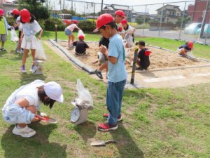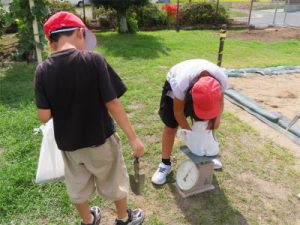 本時は、今まで学んだことを生かして、砂を使って重さづくりをする学習をしました。運動場の砂場で、レジ袋に1kgの砂を入れ、実際に量りました。その後、500gや100gという与えられた課題に対し、予想しながら砂をレジ袋に入れ、はかりに置き、重さがあっていたかを確認していました。この学習を通して、適切に計器や普遍単位を使うことができるようになり、重さの量感を身に付け、生活に生かしていけるといいなと思います。