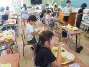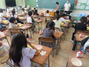 1年生の給食の様子をのぞくと、「お月見汁」の中に「こめこだんご」を見つけると喜んだり、普段あまり口にしない「里芋コロッケ」を味わったりしていました。季節を感じながら、おいしく給食をいただきました。