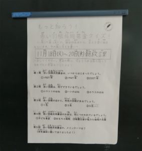 11/18(火)~20(木)が募金期間です。今年度は、運営委員が中心となり赤い羽根クイズを実施することなりました。クイズの問題は各クラスに前もって知らせてあります。