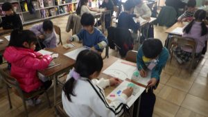 10点の的や1点の的をねらって、自分のおはじきを指ではじきます。そして、その合計点を数えて、互いの点数を競い合いました。はじく強さに気を付けながら、慎重に的をねらっていました。おはじきをはじいた後は、二人で計算をしました。互いの計算が異なっていた時は、おはじきの数や位置を確認して、もう一度見直していました。