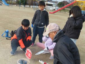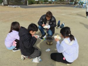 炭に火をつけるのは大変ですが、とても頼りになる地域の皆さんが、ボランティアで子どもたちの活動を手伝ってくださいました。七輪に新聞紙や割り箸の切れ端と炭を置き、火をつけて、うちわで空気を送りました。炭に火がついたら、網をのせてその上に切り餅をきれいに並べ、両面をじっくり焼いて完成です。