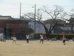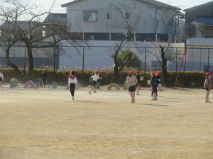 ボール運動では、3~4人1組でサッカーボールをスローインの要領で投げて渡したり、サッカーボールを蹴って転がしたりしました。友達と協力してボール蹴り運動を楽しめるように、簡単な課題から少しずつ難しい課題に挑戦していきました。子どもたちは、先生の説明をしっかり聞いて、落ち着いて運動に取り組んでいたのが印象的でした。この活動に慣れていって、さらにボール蹴り運動を楽しめるといいですね。