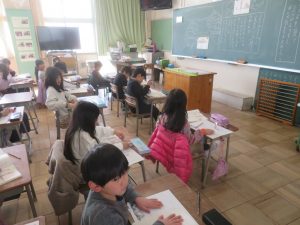 1年生の学習も終わりに近づいてきたこともあり、長いお話ではありますが、声をそろえて元気よく音読することができました。そして、挿絵を見ながら、死んでしまったエルフに対する「ぼく」の気持ちを考えて、プリントにいっぱい書きました。そして、近くの子と自分の考えを伝え合い、最後は全体の場で発表をしていました。