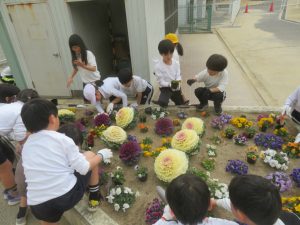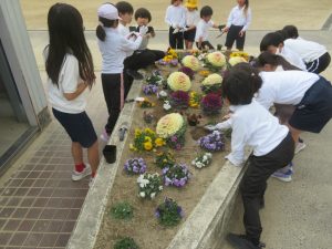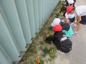 先日、地域の方にパンジーの苗をたくさんいただきました。その苗を、環境委員会の5・6年生と1年生の子たちに植えてもらいました。