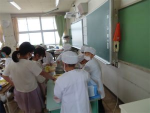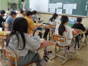 一方、2年生以上の子どもたちは、慣れた様子で手際よく配膳を進めていました。どのクラスでも人気メニューに喜ぶ笑顔が見られ、楽しい給食の時間となりました。